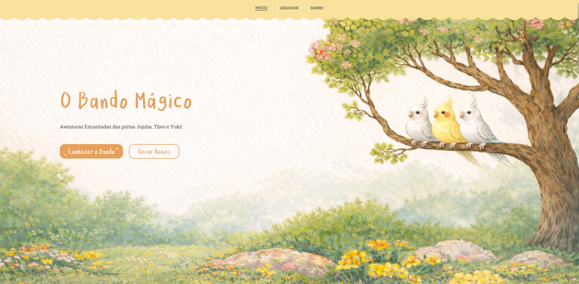 Site em homenagem às calopsitas Jujuba, Theo e Yuki, com ilustrações em aquarela e gerador de nomes.